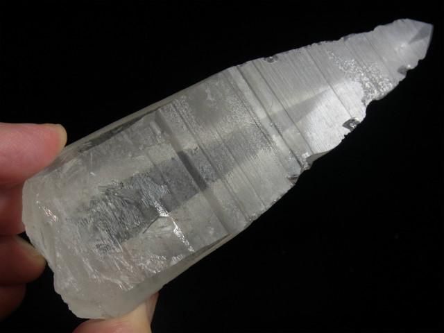ブラジル、ミナスジェライス州、セーラ・デ・カブラル(カブラル山脈)で産出された水晶で、結晶の側面にレムリアンリッジと呼ばれるバーコード状の条線(成長線)があるのが特徴です。表面はレムリアンリッジの影響ですりガラス状の柱面と透明感のある柱面の両方が見られたりしますが、結晶内部はかなり透明感があります。
