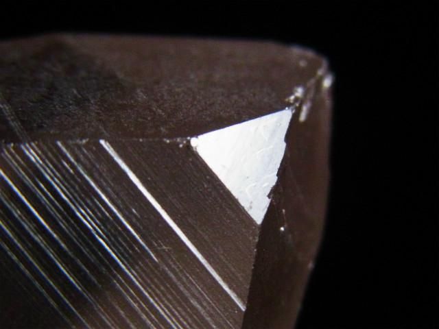 柱面及び大きい錐面の側面に斜めの階段状のレムリアンリッジの段差が見られますが、これはかつて錐面として成長していた部分の名残りです。