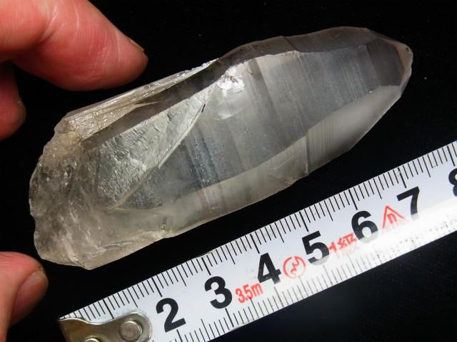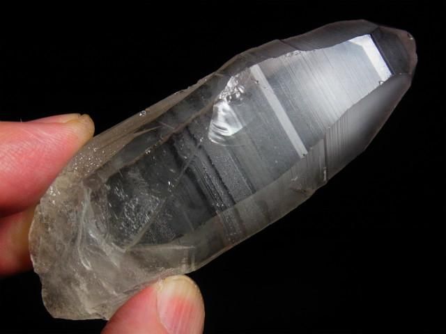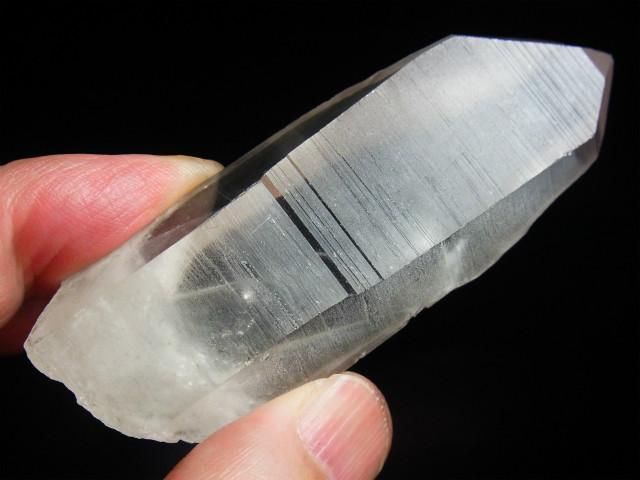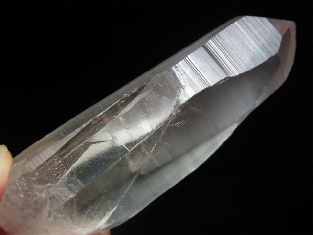 ブラジル、ミナスジェライス州、セーラ・デ・カブラル(カブラル山脈)で産出された水晶で、結晶の側面にレムリアンリッジと呼ばれるバーコード状の条線(成長線)があるのが特徴です。表面はレムリアンリッジの影響ですりガラス状の柱面と透明感のある柱面の両方が見られたりしますが、結晶内部はかなり透明感があります。