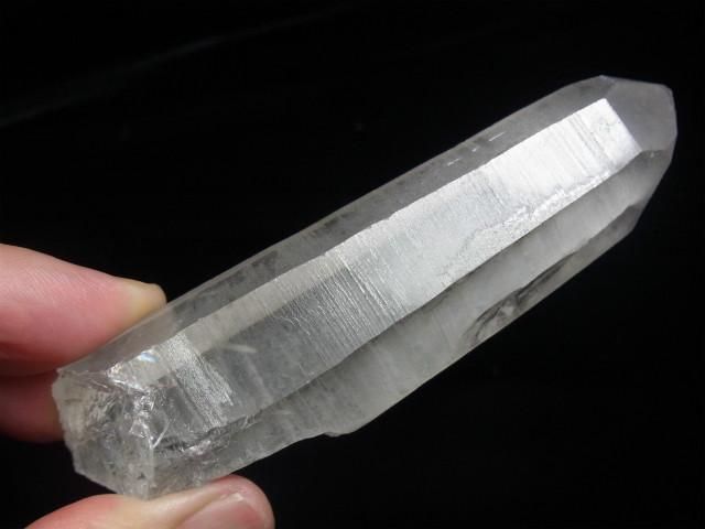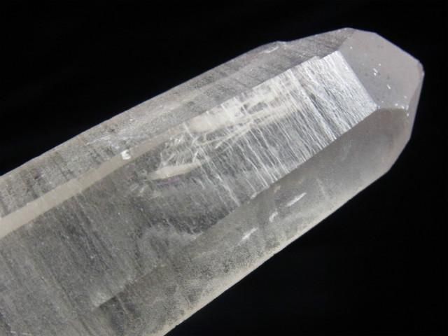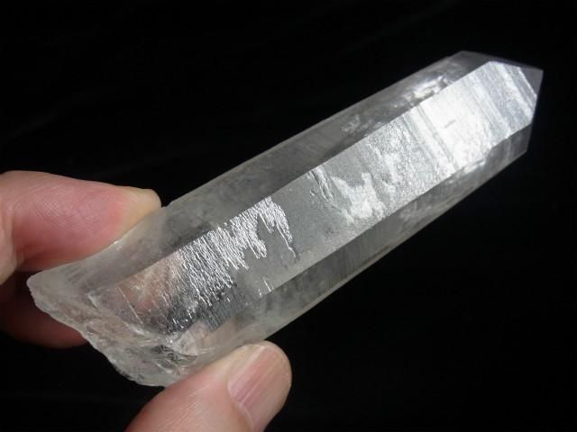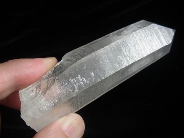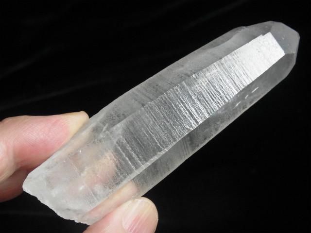 ブラジル、ミナスジェライス州、セーラ・デ・カブラル(カブラル山脈)で産出された水晶で、結晶の側面にレムリアンリッジと呼ばれるバーコード状の条線(成長線)があるのが特徴です。表面はレムリアンリッジの影響ですりガラス状の柱面と透明感のある柱面の両方が見られたりしますが、結晶内部はかなり透明感があります。