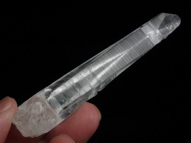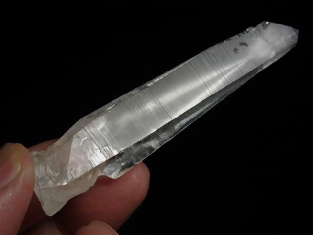 ブラジル、ミナスジェライス州、セーラ・デ・カブラル(カブラル山脈)で産出された水晶で、結晶の側面にレムリアンリッジと呼ばれるバーコード状の条線(成長線)があるのが特徴です。表面はレムリアンリッジの影響ですりガラス状の柱面と透明感のある柱面の両方が見られたりしますが、結晶内部はかなり透明感があります。
