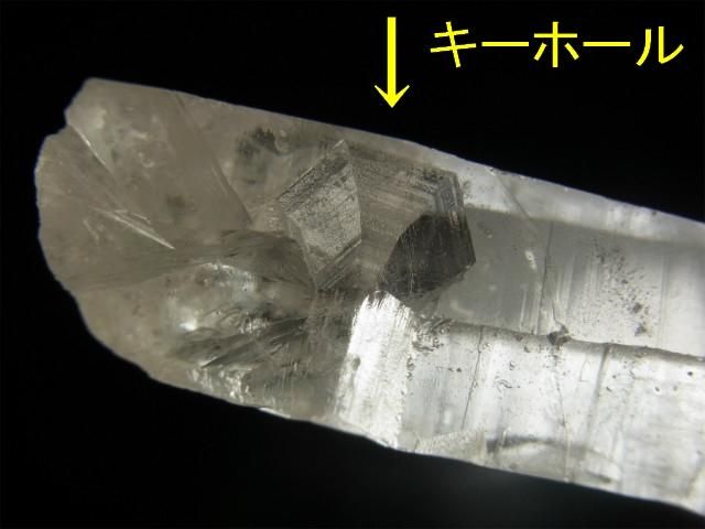 キーとは、結晶の形をした穴(キーホール)で、六角形や三角形の窪みになっているものです。これは他の結晶や貫入水晶の結晶先端が外れた跡などに見られます。