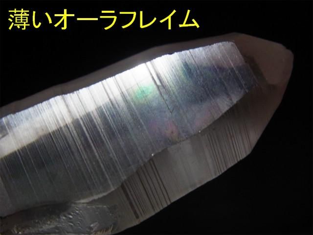 オーラフレイムとはオーラの炎という意味で、水晶の表面が鉄分やチタン、マグネシウムなどにより天然のコーティングをされた状態で、まるで油膜のようなしぶい虹色が見られるものです。