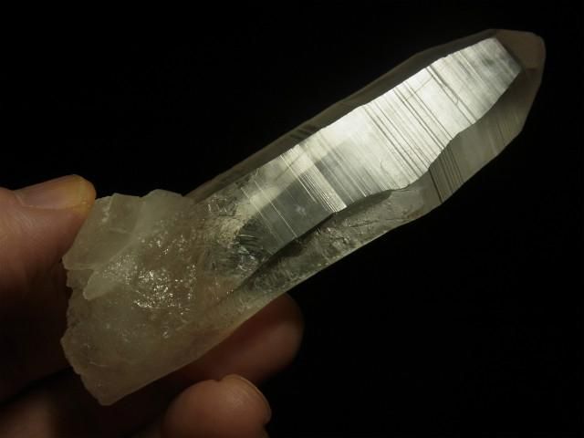 ブラジル、ミナスジェライス州、セーラ・デ・カブラル(カブラル山脈)で産出された水晶で、結晶の側面にレムリアンリッジと呼ばれるバーコード状の条線(成長線)があるのが特徴です。表面はレムリアンリッジの影響ですりガラス状の柱面と透明感のある柱面の両方が見られたりしますが、結晶内部はかなり透明感があります。