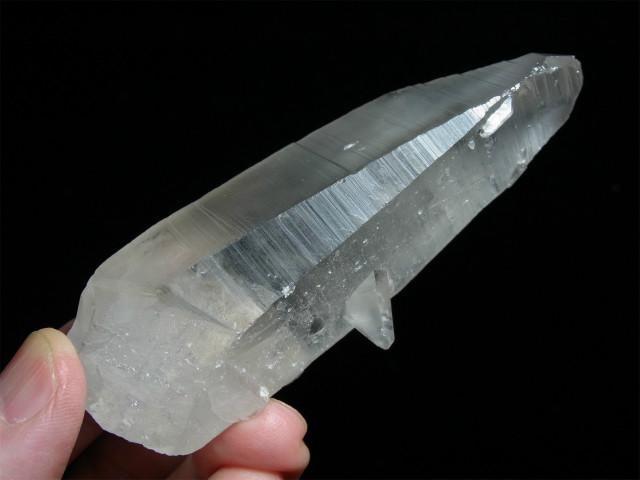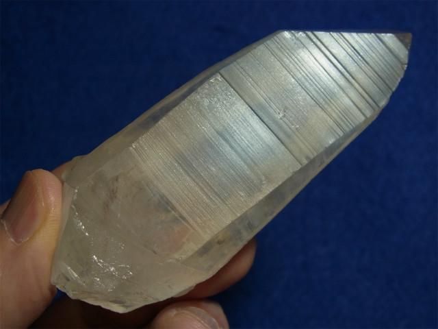 ブラジル、ミナスジェライス州、セーラ・デ・カブラル(カブラル山脈)で産出された水晶で、結晶の側面にレムリアンリッジと呼ばれるバーコード状の条線(成長線)があるのが特徴です。表面はレムリアンリッジの影響ですりガラス状の柱面と透明感のある柱面の両方が見られたりしますが、結晶内部はかなり透明感があります。