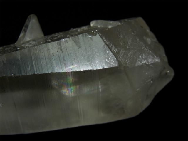 写真のように貫入水晶がある柱面を手前にして角度を変えると薄いレインボーが浮かび上がります。
