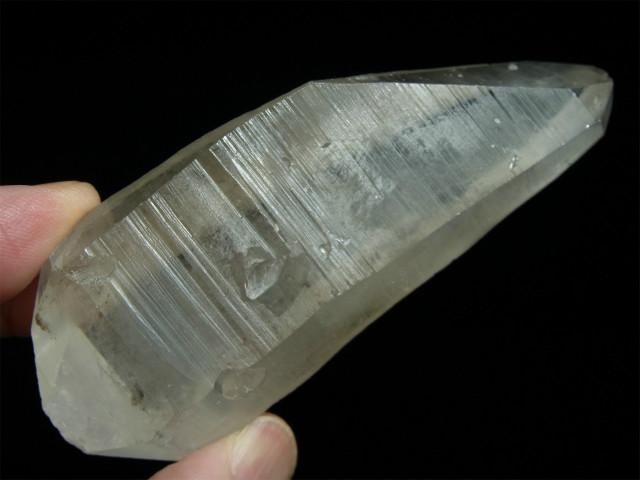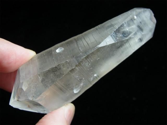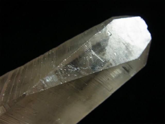 ブラジル、ミナスジェライス州、セーラ・デ・カブラル(カブラル山脈)で産出された水晶で、結晶の側面にレムリアンリッジと呼ばれるバーコード状の条線(成長線)があるのが特徴です。表面はレムリアンリッジの影響ですりガラス状の柱面と透明感のある柱面の両方が見られたりしますが、結晶内部はかなり透明感があります。