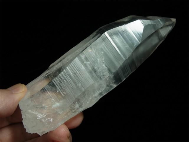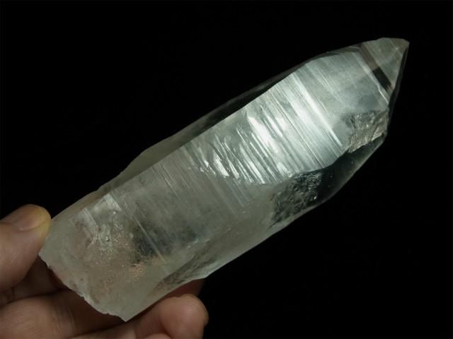 ブラジル、ミナスジェライス州、セーラ・デ・カブラル(カブラル山脈)で産出された水晶で、結晶の側面にレムリアンリッジと呼ばれるバーコード状の条線(成長線)があるのが特徴です。表面はレムリアンリッジの影響ですりガラス状の柱面と透明感のある柱面の両方が見られたりしますが、結晶内部はかなり透明感があります。