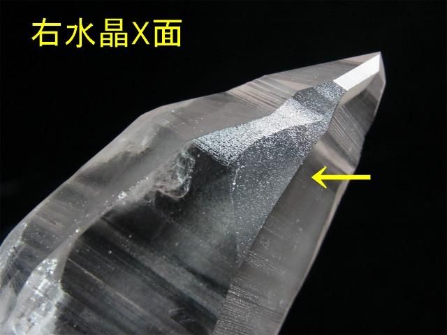 通常、外見ではなかなか判断できませんが、稀に、結晶錐面の斜め下側辺りに、X面と呼ばれる小さい面が表れることがあり、この面が錐面の右側に出た結晶は右水晶、左側に出たものは左水晶であることが目で見て判断出来ます。