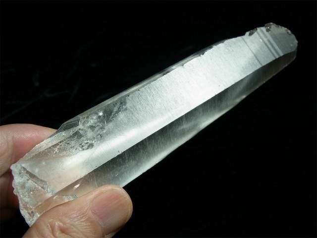 ブラジル、ミナスジェライス州、セーラ・デ・カブラル(カブラル山脈)で産出された水晶で、結晶の側面にレムリアンリッジと呼ばれるバーコード状の条線(成長線)があるのが特徴です。表面はレムリアンリッジの影響ですりガラス状の柱面と透明感のある柱面の両方が見られたりしますが、結晶内部はかなり透明感があります。