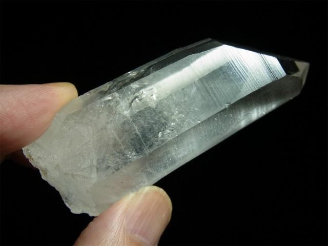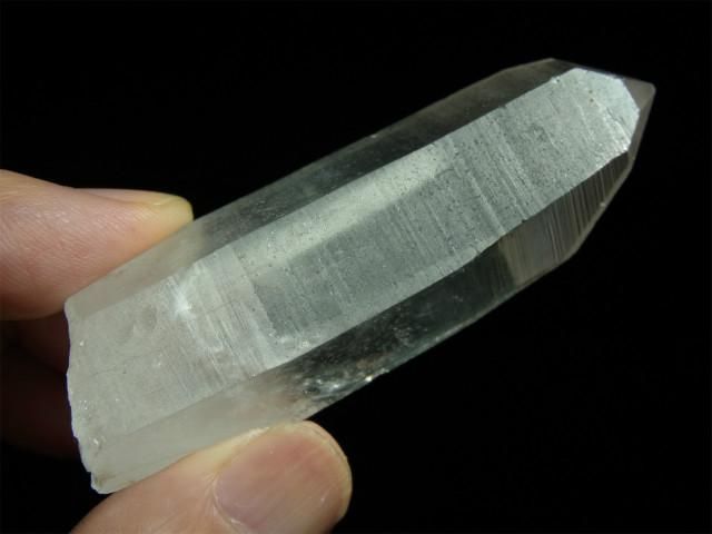 ブラジル、ミナスジェライス州、セーラ・デ・カブラル(カブラル山脈)で産出された水晶で、結晶の側面にレムリアンリッジと呼ばれるバーコード状の条線(成長線)があるのが特徴です。表面はレムリアンリッジの影響ですりガラス状の柱面と透明感のある柱面の両方が見られたりしますが、結晶内部はかなり透明感があります。
