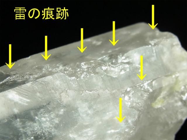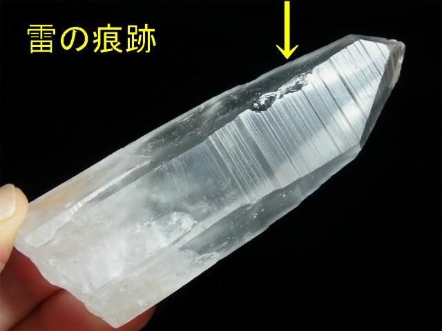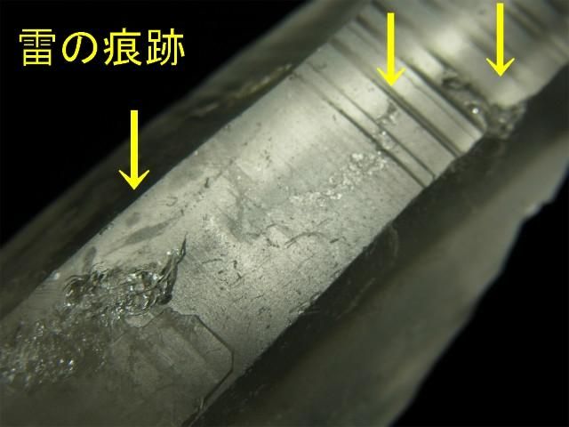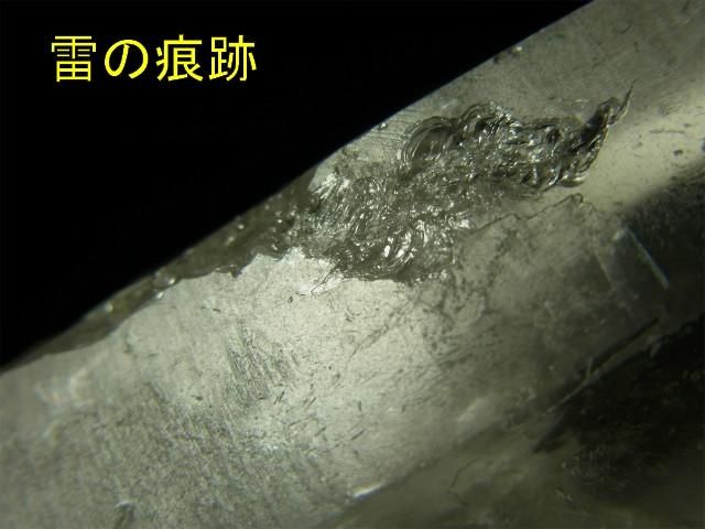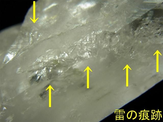 水晶の表面には雷水晶特有のギザギザの伝導跡や、一瞬の高温による白濁、周辺の泥土を伴い溶かされた跡、すさまじい衝撃によるクラックなどが特徴として見られます。