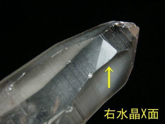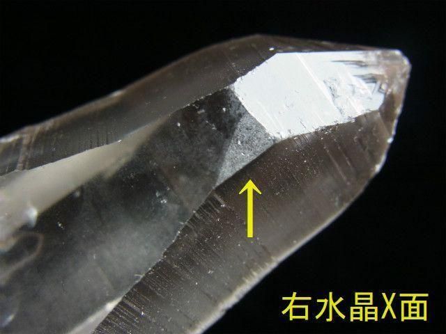 通常、外見ではなかなか判断できませんが、稀に、結晶錐面の斜め下側辺りに、X面と呼ばれる小さい面が表れることがあり、この面が錐面の右側に出た結晶は右水晶、左側に出たものは左水晶であることが目で見て判断出来ます。