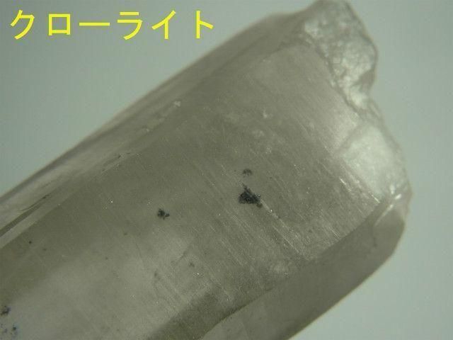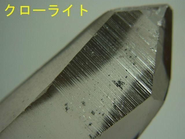 結晶内部に暗緑色の小さいクローライトが点在して内包されています。