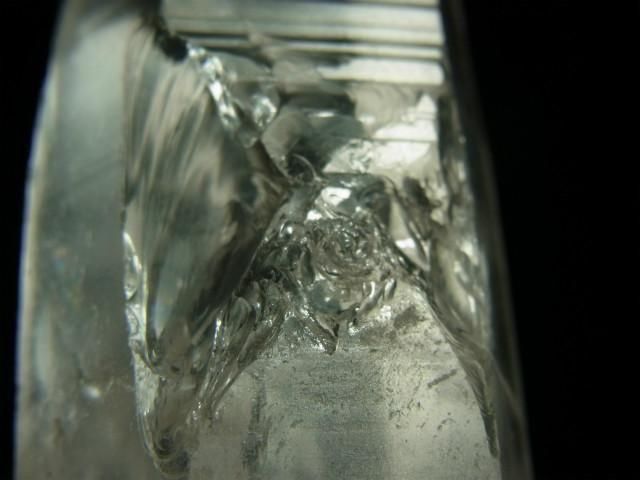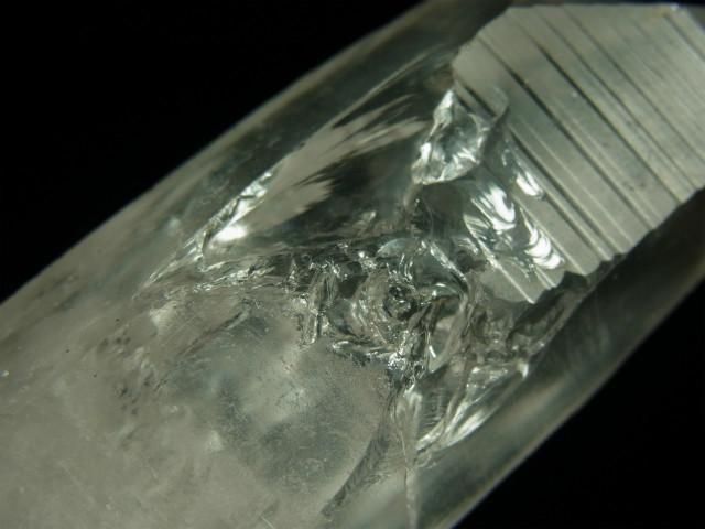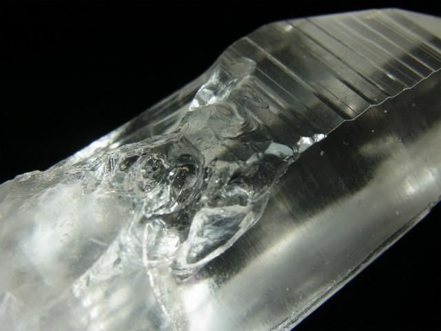 水晶の表面には雷水晶特有のギザギザの伝導跡や、一瞬の高温による白濁、周辺の泥土を伴い溶かされた跡、すさまじい衝撃によるクラックなどが特徴として見られます。