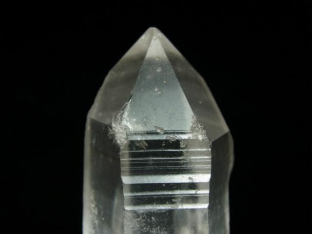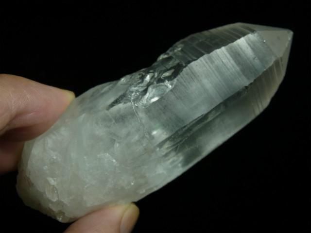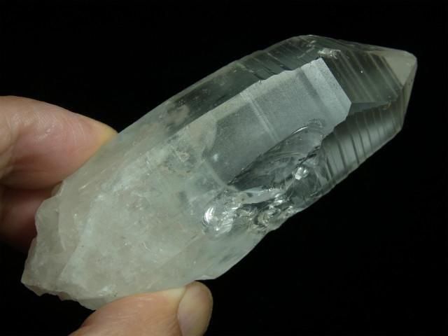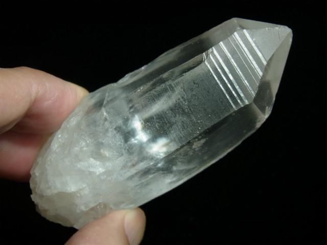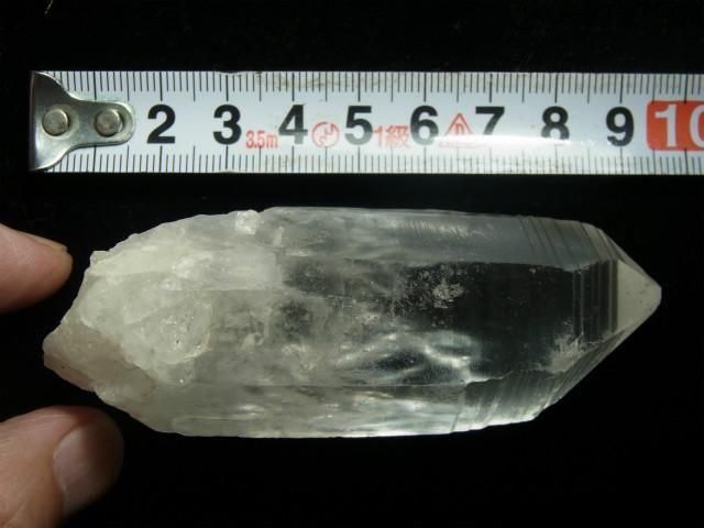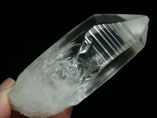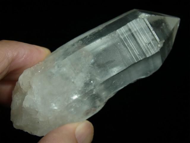 ブラジル、ミナスジェライス州、セーラ・デ・カブラル(カブラル山脈)で産出された水晶で、結晶の側面にレムリアンリッジと呼ばれるバーコード状の条線(成長線)があるのが特徴です。表面はレムリアンリッジの影響ですりガラス状の柱面と透明感のある柱面の両方が見られたりしますが、結晶内部はかなり透明感があります。