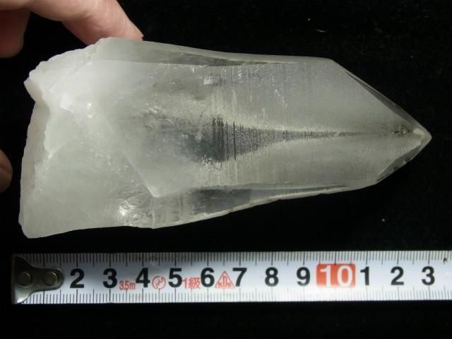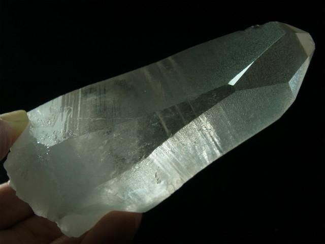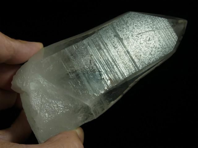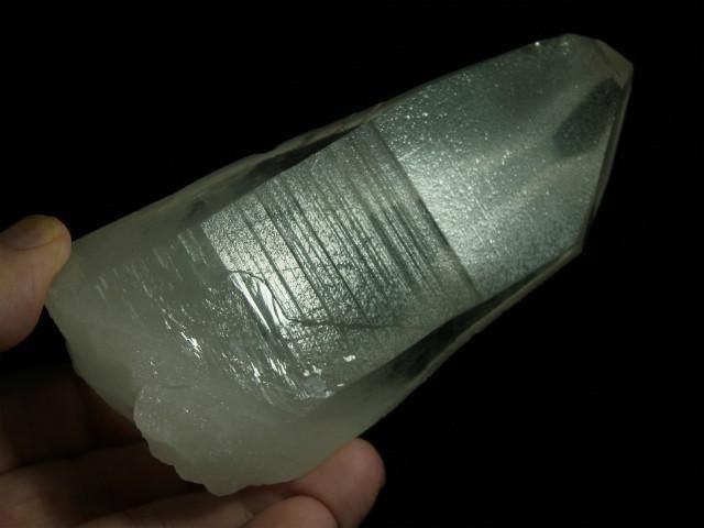 ブラジル、ミナスジェライス州、セーラ・デ・カブラル(カブラル山脈)で産出された水晶で、結晶の側面にレムリアンリッジと呼ばれるバーコード状の条線(成長線)があるのが特徴です。表面はレムリアンリッジの影響ですりガラス状の柱面と透明感のある柱面の両方が見られたりしますが、結晶内部はかなり透明感があります。