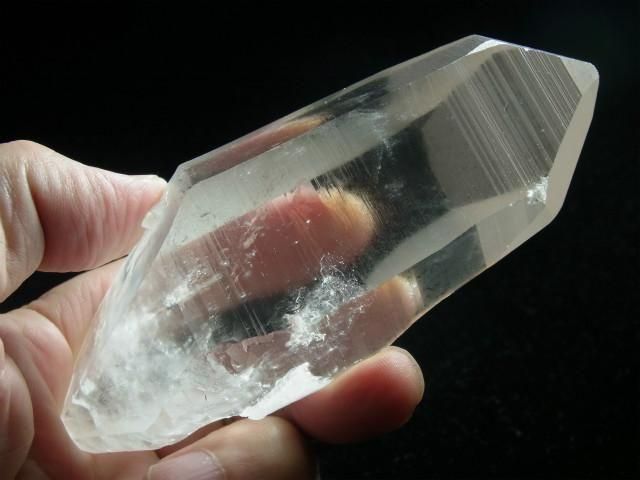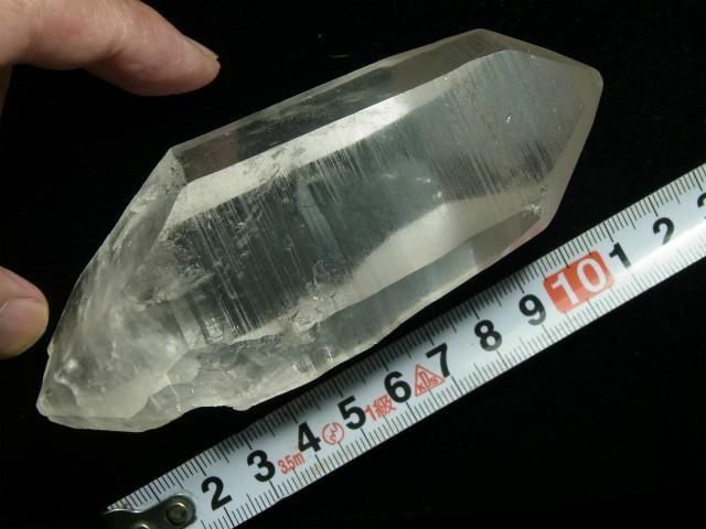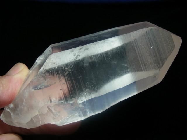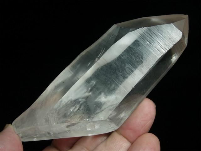 ブラジル、ミナスジェライス州、セーラ・デ・カブラル(カブラル山脈)で産出された水晶で、結晶の側面にレムリアンリッジと呼ばれるバーコード状の条線(成長線)があるのが特徴です。表面はレムリアンリッジの影響ですりガラス状の柱面と透明感のある柱面の両方が見られたりしますが、結晶内部はかなり透明感があります。