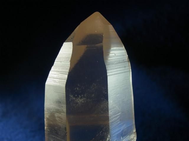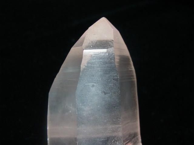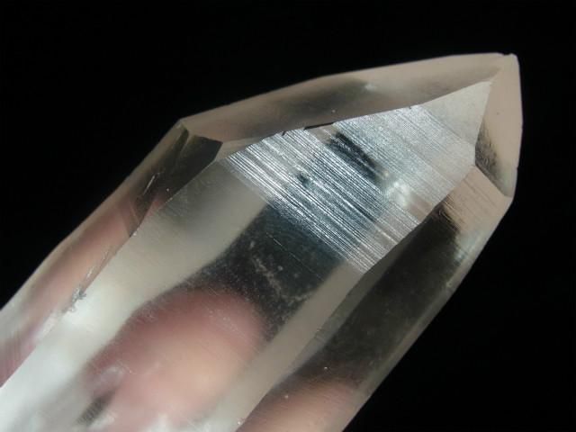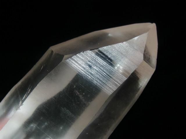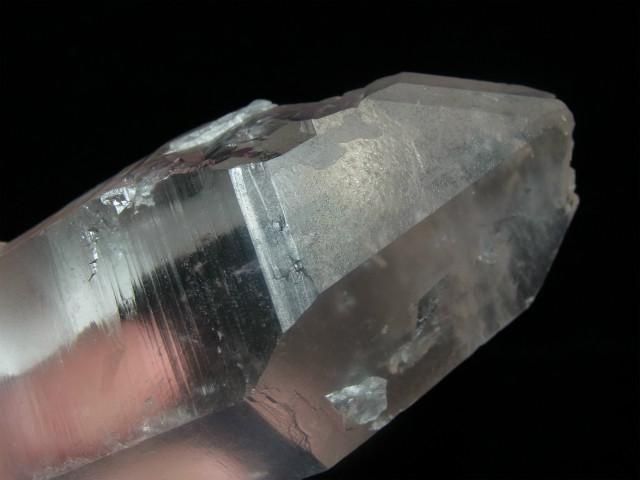 見事なレムリアンリッジと斜めの階段状の段差が出ており、わずかにすりガラス状に見える柱面と、透明度が高く、レムリアンリッジが薄めで照りがある柱面の両方が見られます。