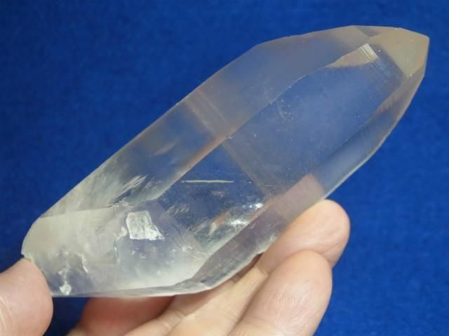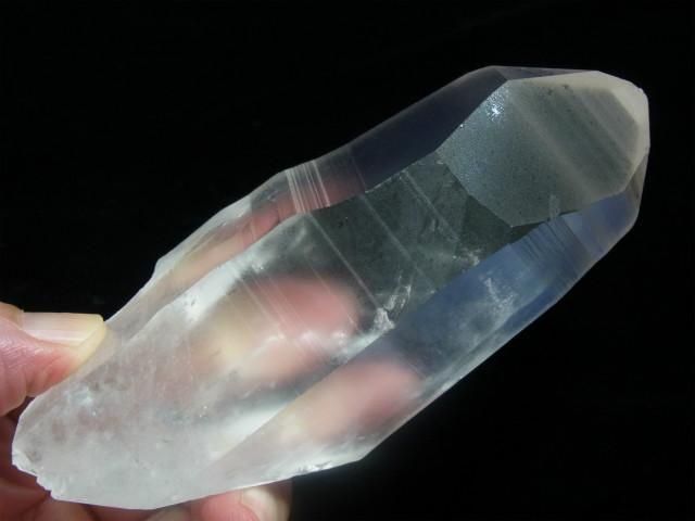 一見、透明に見えます。 よく見ると、両剣結晶の両方の錐面上部がうっすらと極薄いピンク色味を帯びているのが分かる程度です。