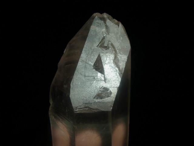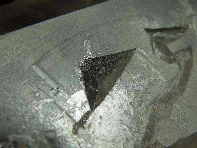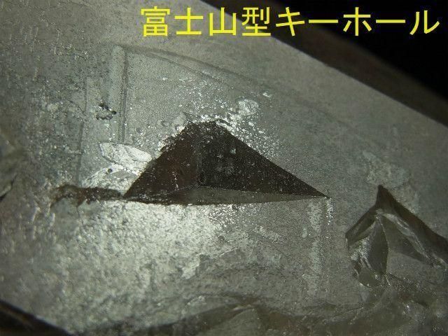 これらのことから、三角形の窪みは、貫入水晶が綺麗に外れたキーホールであることが容易に推察されます。