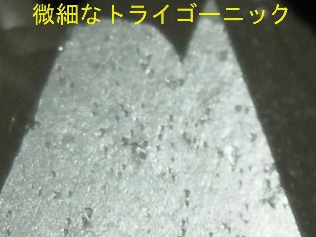 微細なサイズの逆三角形の窪み(▼蝕象)なので、光に反射させて倍率10倍のルーペで見て確認できる程度の大きさです。