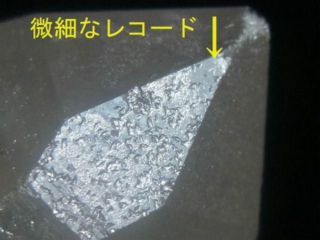 このレコードは透明で微細なサイズなので、光に反射させてルーペで見てやっと分かる程度の大きさです。
