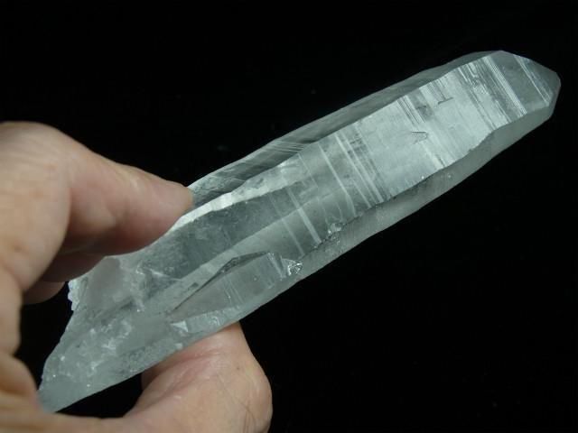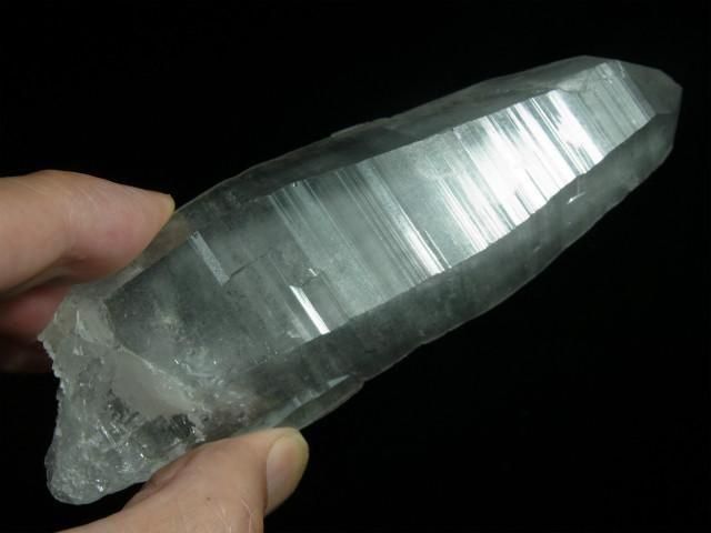 ブラジル、ミナスジェライス州、セーラ・デ・カブラル(カブラル山脈)で産出された水晶で、結晶の側面にレムリアンリッジと呼ばれるバーコード状の条線(成長線)があるのが特徴です。表面はレムリアンリッジの影響ですりガラス状の柱面と透明感のある柱面の両方が見られたりしますが、結晶内部はかなり透明感があります。