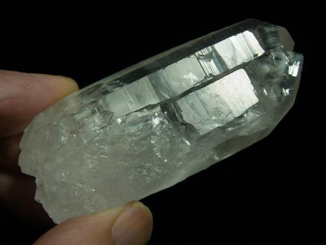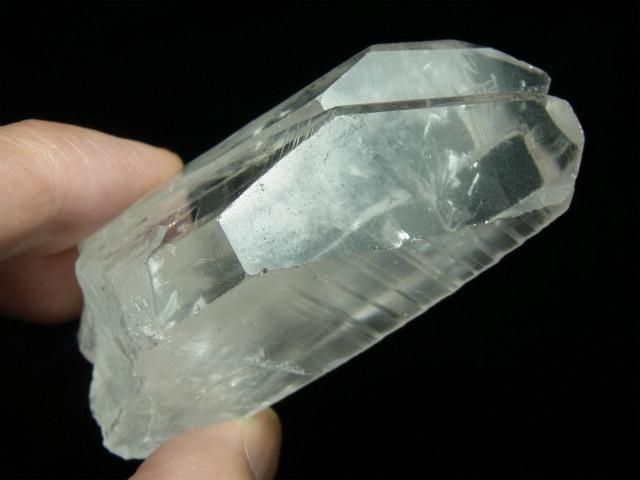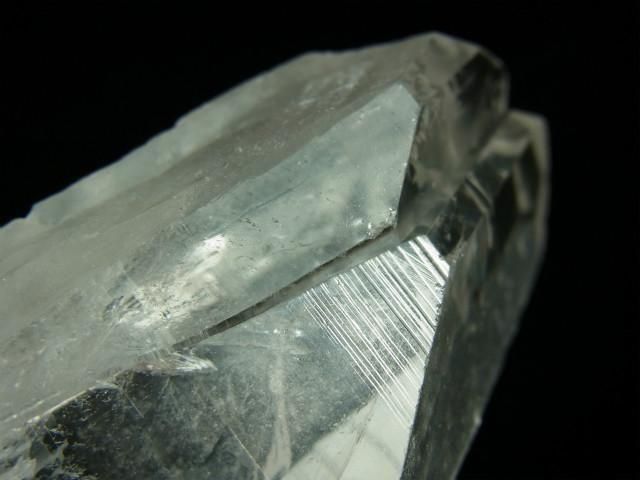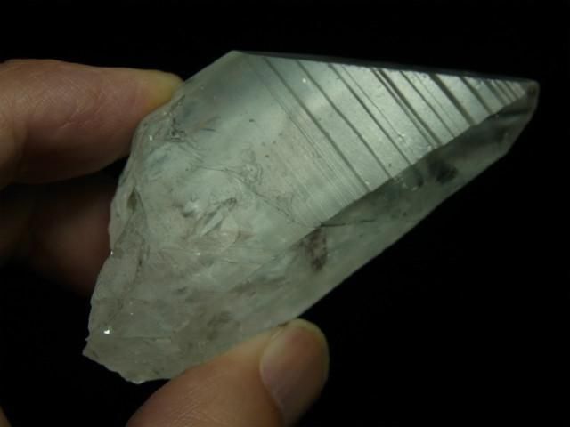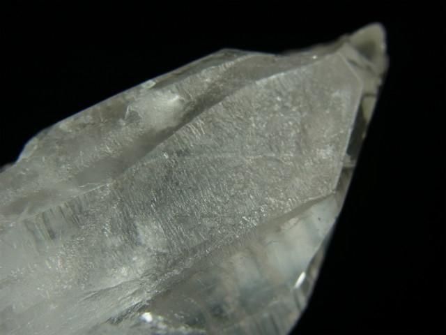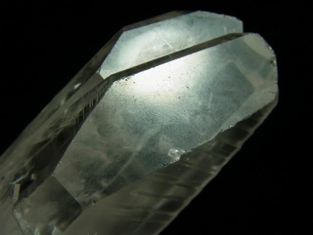 わずかにすりガラス状で、見事なレムリアンリッジと斜めの階段状の段差が出ている幅の広い柱面と、透明度が高く照りがある幅が狭めの柱面の両方があります。