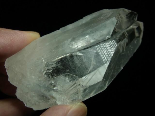 ブラジル、ミナスジェライス州、セーラ・デ・カブラル(カブラル山脈)で産出された水晶で、結晶の側面にレムリアンリッジと呼ばれるバーコード状の条線(成長線)があるのが特徴です。表面はレムリアンリッジの影響ですりガラス状の柱面と透明感のある柱面の両方が見られたりしますが、結晶内部はかなり透明感があります。