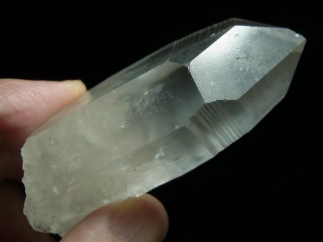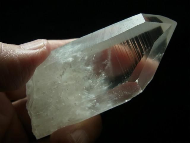 ブラジル、ミナスジェライス州、セーラ・デ・カブラル(カブラル山脈)で産出された水晶で、結晶の側面にレムリアンリッジと呼ばれるバーコード状の条線(成長線)があるのが特徴です。表面はレムリアンリッジの影響ですりガラス状の柱面と透明感のある柱面の両方が見られたりしますが、結晶内部はかなり透明感があります。
