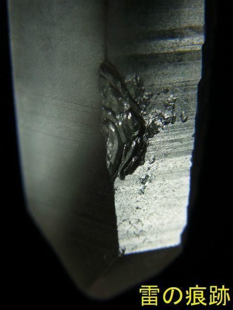 水晶の表面には雷水晶特有のギザギザの伝導跡や、一瞬の高温による白濁(クリストバライト現象)、周辺の泥土を伴い溶かされた跡、すさまじい衝撃によるクラックなどが特徴として見られます。