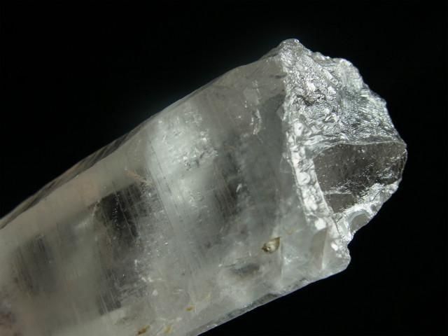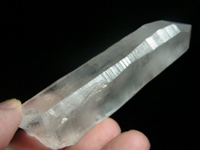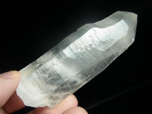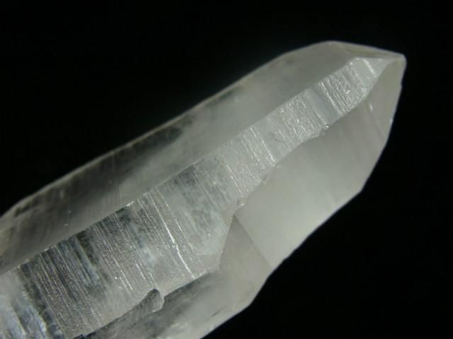 ブラジル、ミナスジェライス州、セーラ・デ・カブラル(カブラル山脈)で産出された水晶で、結晶の側面にレムリアンリッジと呼ばれるバーコード状の条線(成長線)があるのが特徴です。表面はレムリアンリッジの影響ですりガラス状の柱面と透明感のある柱面の両方が見られたりしますが、結晶内部はかなり透明感があります。