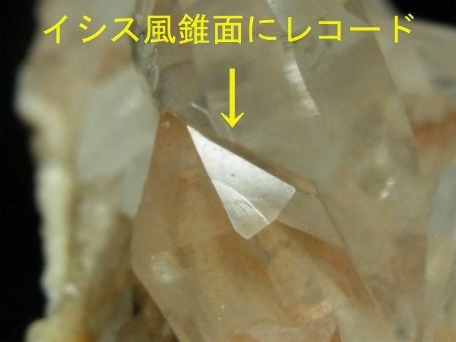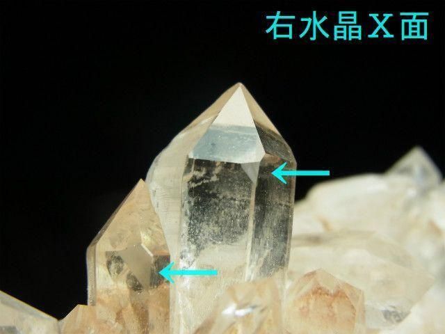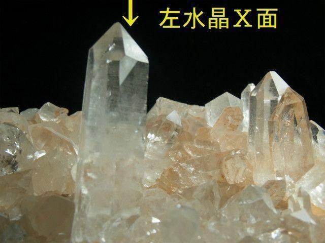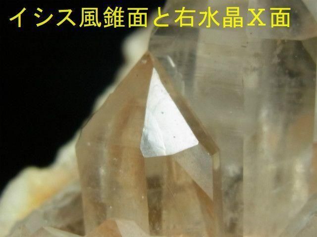 一番大きい結晶はイシス風の錐面左下にX面が出ている左水晶です。
